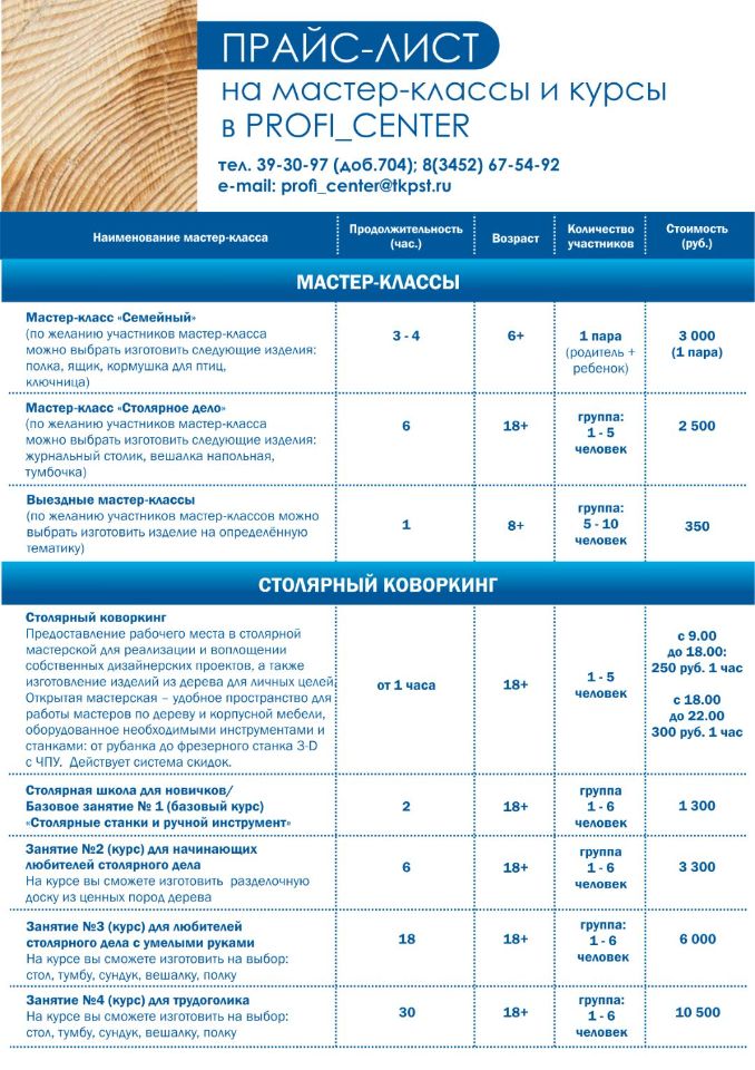 Вы сделаете и заберете с собой изготовленное своими руками изделие из дерева. Всем желающим, без опыта столярного производства, будет предоставлен опытный наставник под руководством которого Вы приобретете бесценные знания и навыки.